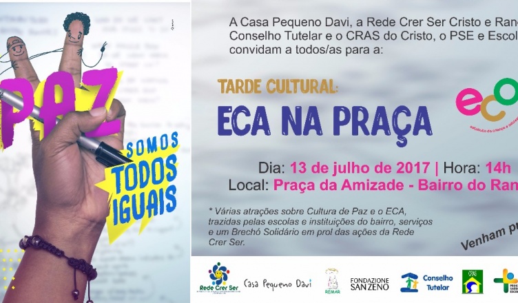 A Casa Pequeno Davi, a Rede Crer Ser do Cristo e Range, o Conselho Tutelar e o CRAS do Cristo e escolas convidam a todos/as para a “Tarde Cultural: ECA NA PRAÇA” que será realizada na programação do aniversário de 27 anos do Estatuto da Criança e do Adolescente, dia 13 de julho, às 14 horas, na Praça da Amizade, no Rangel.