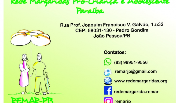 A Rede Margaridas Pró-Criança e Adolescente (Margarida Remar Pereira da Silva) há 15 anos iniciou dua missão “Articular, mobilizar e integrar em rede as instituições governamentais, não governamentais e a sociedade para a efetivação da Política de Proteção Integral da Criança, do Adolescente e de suas Famílias, em vulnerabilidade social no Estado da Paraíba, na construção de uma sociedade justa e solidária”