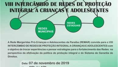 VIII Intercâmbio das Redes 30 de outubro de 2019Remar Comentários A Rede Margaridas Pró-Crianças e Adolescentes da Paraíba (REMAR) convida para o VIII INTERCÂMBIO DE REDES DE PROTEÇÃO INTEGRAL A CRIANÇAS E ADOLESCENTES [...]