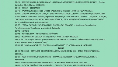 Programação do Festival 29 anos do ECA 15 de outubro de 201915 de outubro de 2019Remar Comentários FESTIVAL RESISTIR SEMPRE, DESISTIR JAMAIS! 29 ANOS DO ESTATUTO DA CRIANÇA E DO ADOLESCENTE “CRIANÇA E ADOLESCENTE: QUEM PROTEGE, RESISTE!” 17 DE [...]