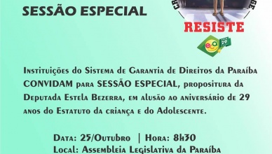 Sessão Especial na ALPB em alusão ao ECA 21 de outubro de 2019Remar Comentários Na sexta, 25 de outubro, às 8h30, na Assembleia Legislativa da Paraíba vai ser realizada uma Sessão Especial alusiva ao aniversário de [...]