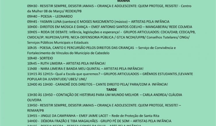 10H05 – RODA DE DEBATE: Infância, legislações e esperança! – GRUPOS ARTICULADOS: CDCA/OAB; CEDCA/PB,