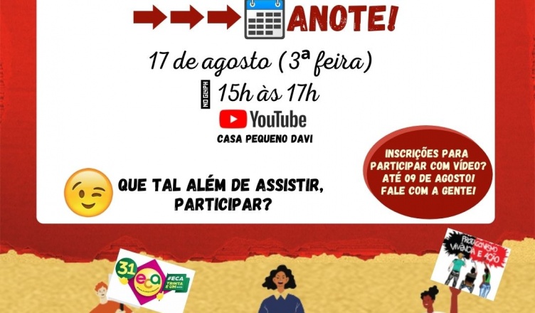 Como? Simples, assim! Mandar vídeo gravado com celular na horizontal, até 2ª feira, 09 de agosto, com no máximo 5 minutos – no qual a criança ou adolescente, com autorização do/a familiar, se apresenta (apresenta o nome da instituição que representa), diz porque é importante falar dos 31 anos do Estatuto da Criança e do Adolescente e faz sua apresentação cultural (canto, dança, poema, encenação, cordel …)