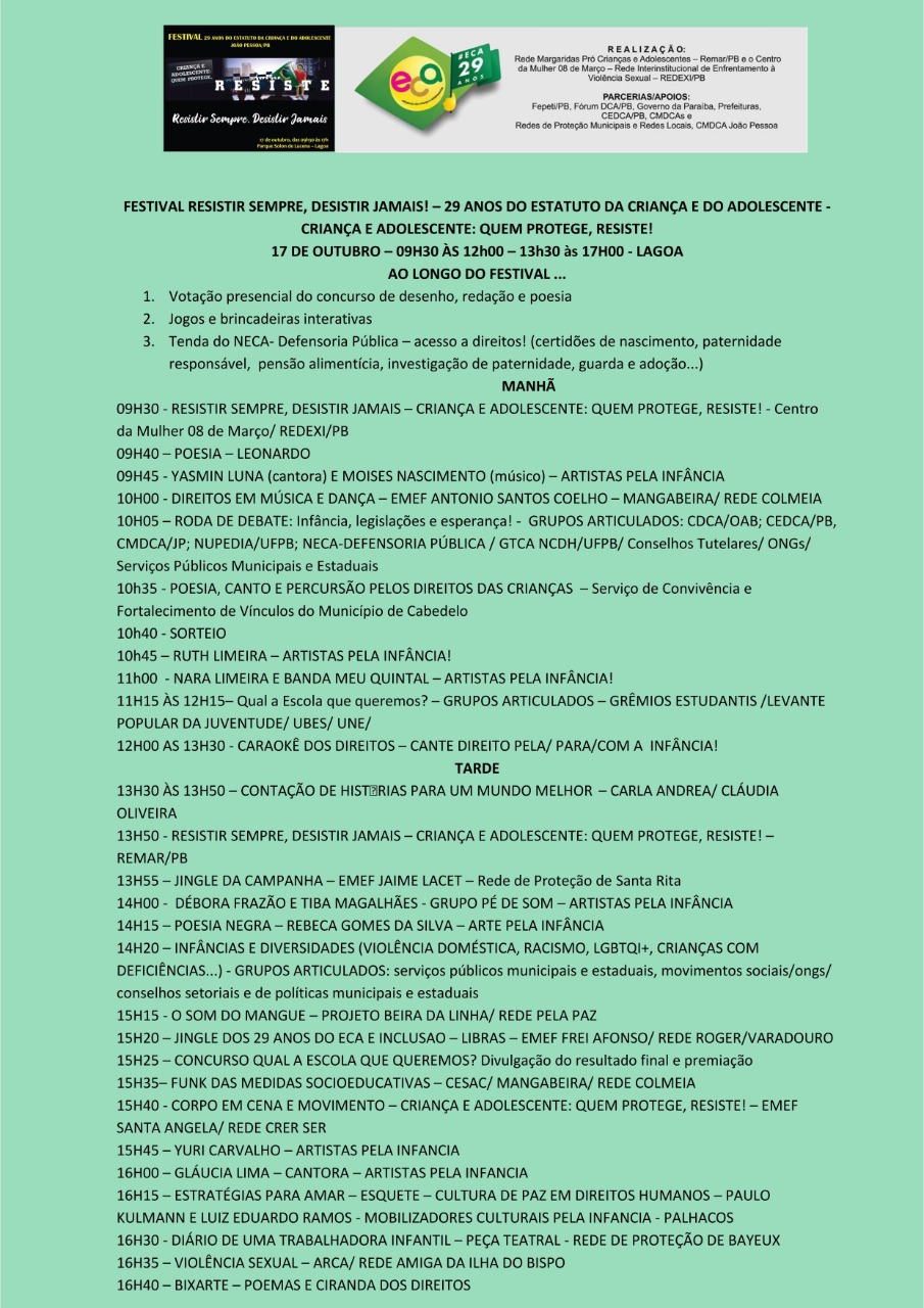 Programação do Festival 29 anos do ECA 15 de outubro de 201915 de outubro de 2019Remar Comentários FESTIVAL RESISTIR SEMPRE, DESISTIR JAMAIS! 29 ANOS DO ESTATUTO DA CRIANÇA E DO ADOLESCENTE “CRIANÇA E ADOLESCENTE: QUEM PROTEGE, RESISTE!” 17 DE [...]