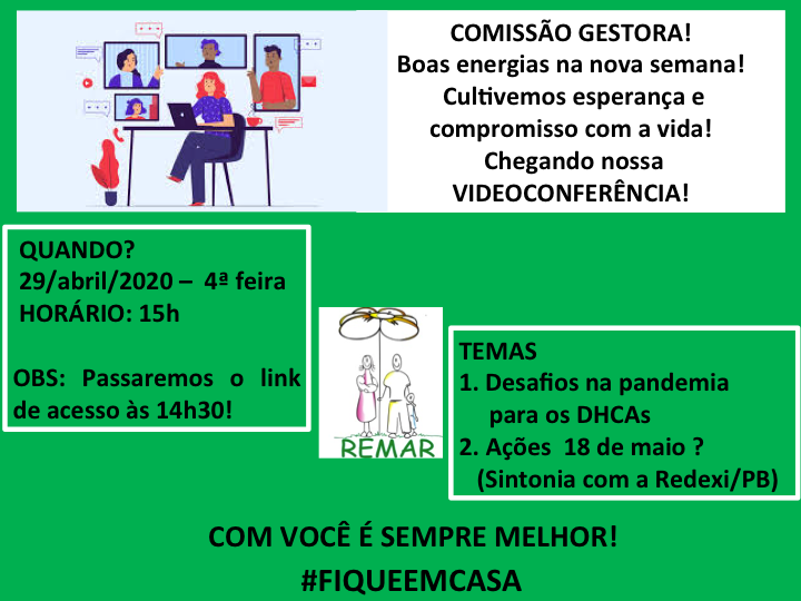 Videoconferência 27 de abril de 2020Remar Comentários Chegando nossa VIDEOCONFERÊNCIA! QUANDO? 29/abril/2020 (4ª feira) | HORÁRIO: 15 horas TEMAS/PAUTA: Desafios na pandemia para os DHCAs; 2. Ações 18 de maio? [...]